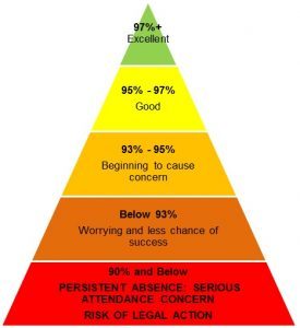 For children to make the most possible progress in their learning, they need to be in school every day. Missed days mean missed learning which as a result can cause for your child to be behind their peers. Children need to aim for 97% attendance. If a child has below 90% you are at risk of receiving a visit from the Education Welfare Officer.