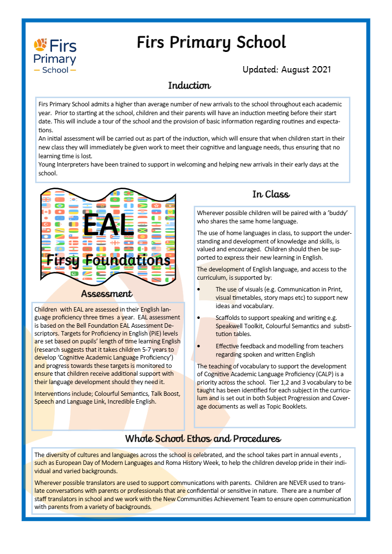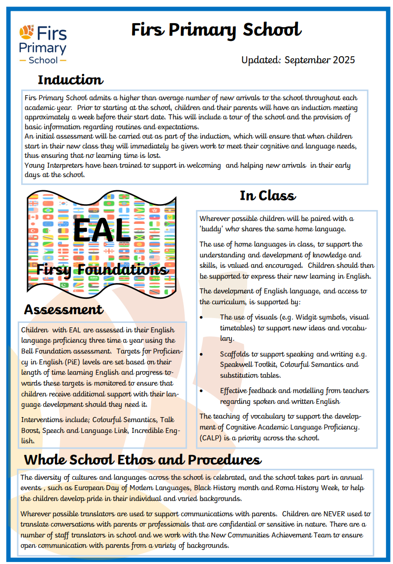 Please see our EAL Firsy Foundations document for further information on EAL at Firs Primary School.