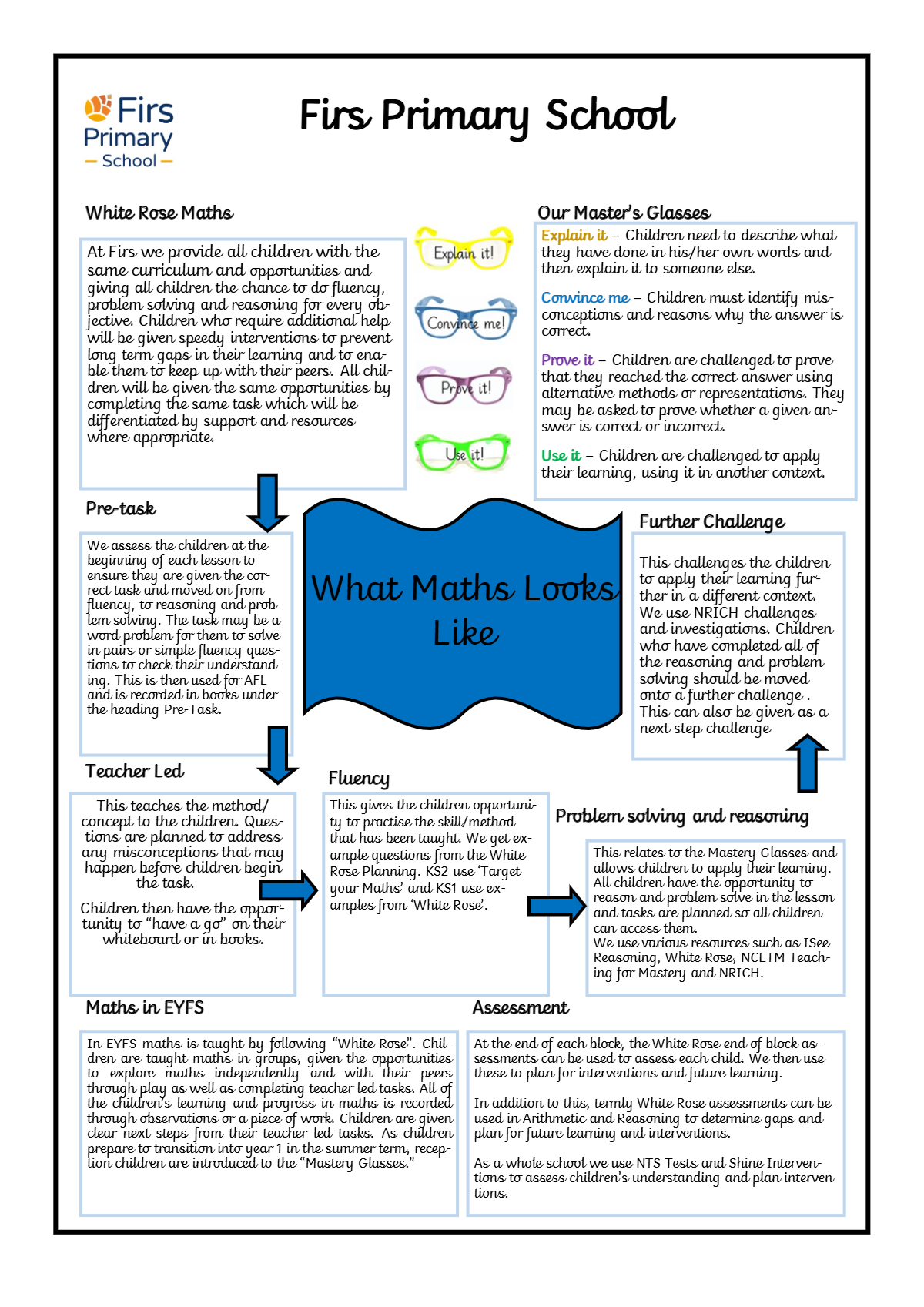 At Firs, we are passionate about ensuring that the learning is at the correct level for the child and allows the child to move at their own pace but always be challenged. This allows for all children to ensure they are secure in a method/concept before moving on. We ensure that all children have the opportunity to apply new methods/concepts learnt through problem solving and reasoning. Our maths lesson structure can be seen below.