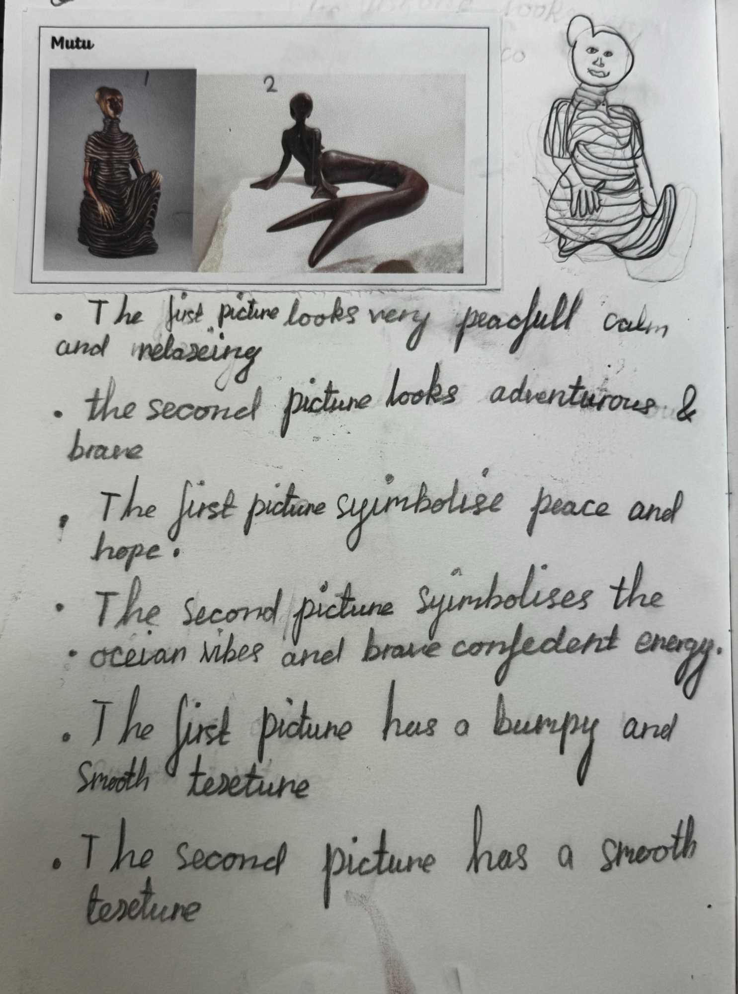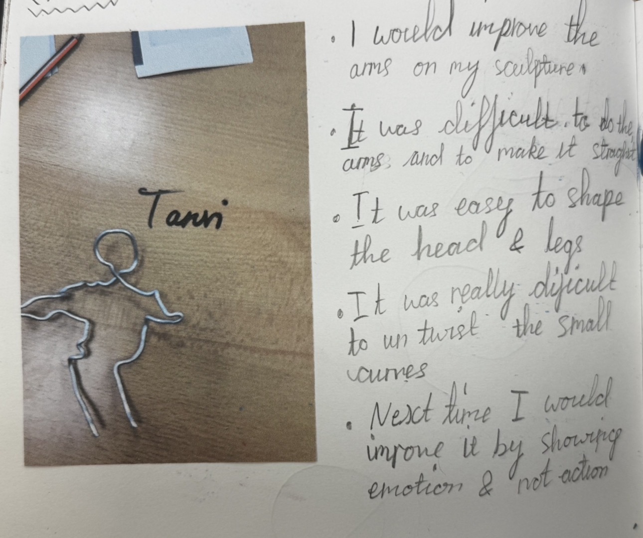 Finally, children evaluate their own work, identifying elements they are pleased with and areas they would improve. They also take part in peer evaluation, offering thoughtful feedback on each other’s work. This may be verbal or be recorded through speech bubbles, annotations or scribed comments in their sketchbooks, supporting both reflection and oracy.