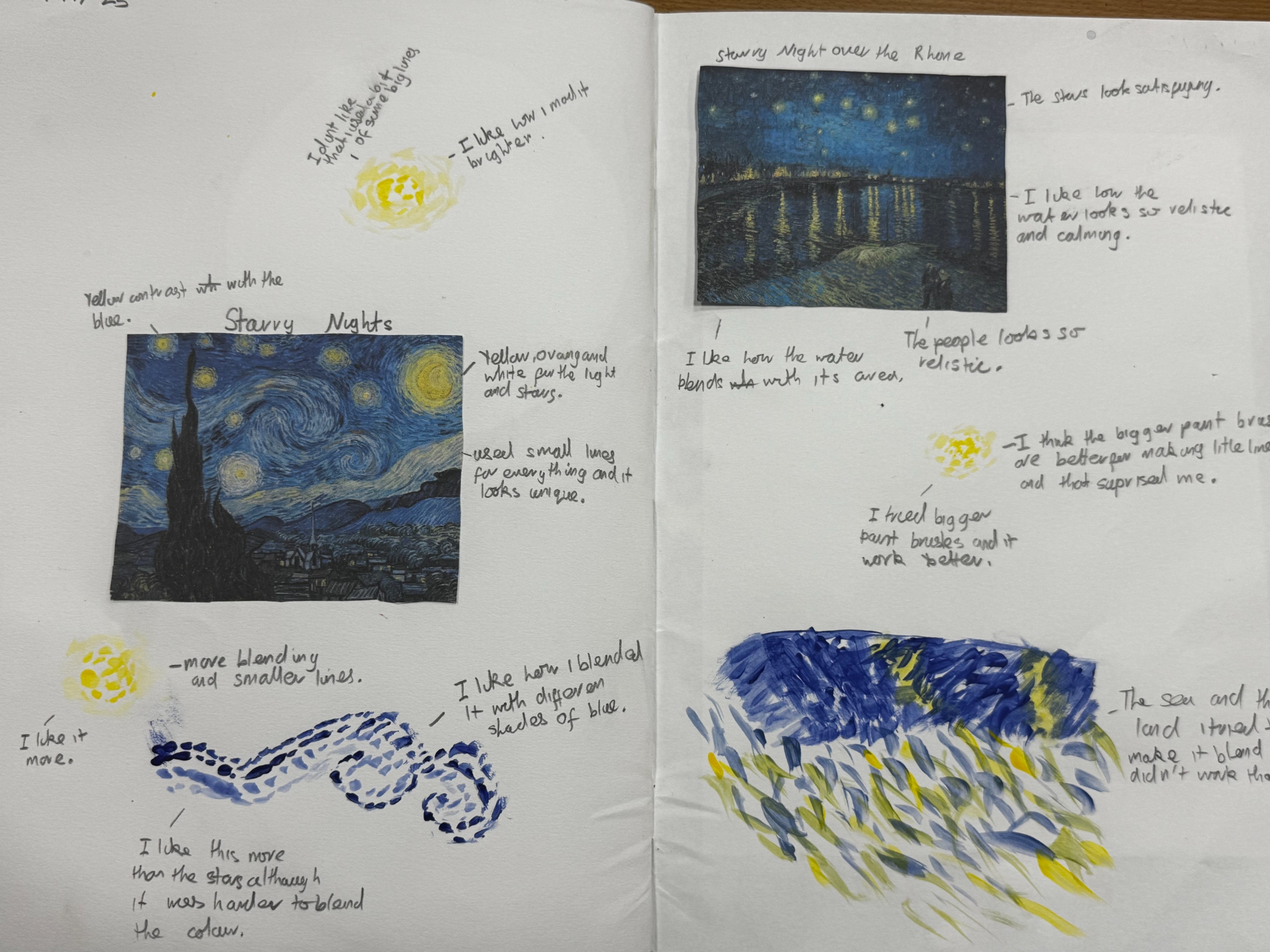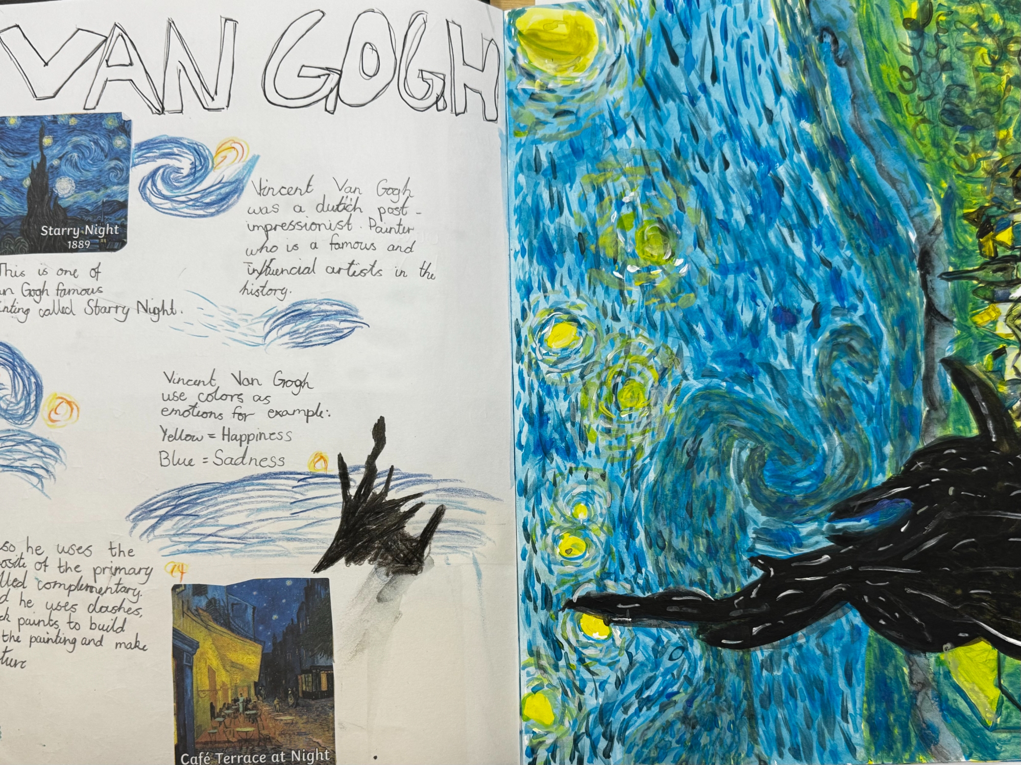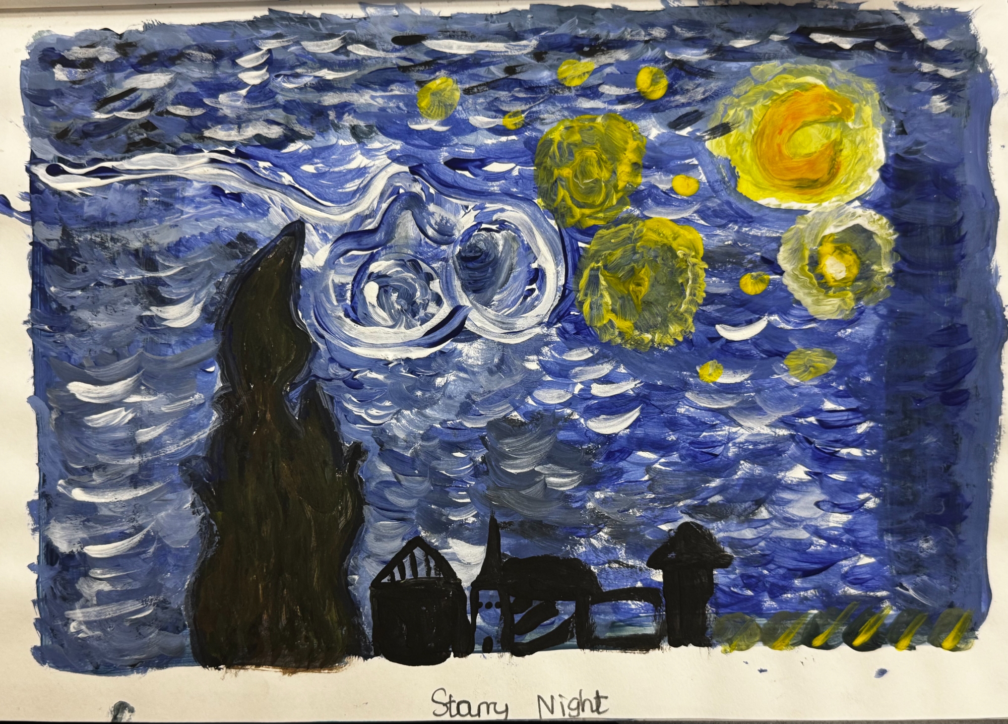 Afterwards, children then apply these skills to create their own artwork, inspired by the style or techniques studied. Teachers model processes and outcomes to support learning, while allowing children the freedom to develop their own ideas and creative responses.