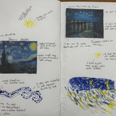 At the start of a learning sequence, children are introduced to artists, designers or craft makers and explore their work in context. They identify similarities and differences between artists, movements and styles, and make meaningful links to their own work. Children record examples of artworks in their sketchbooks and annotate them using artistic vocabulary and their own personal responses.