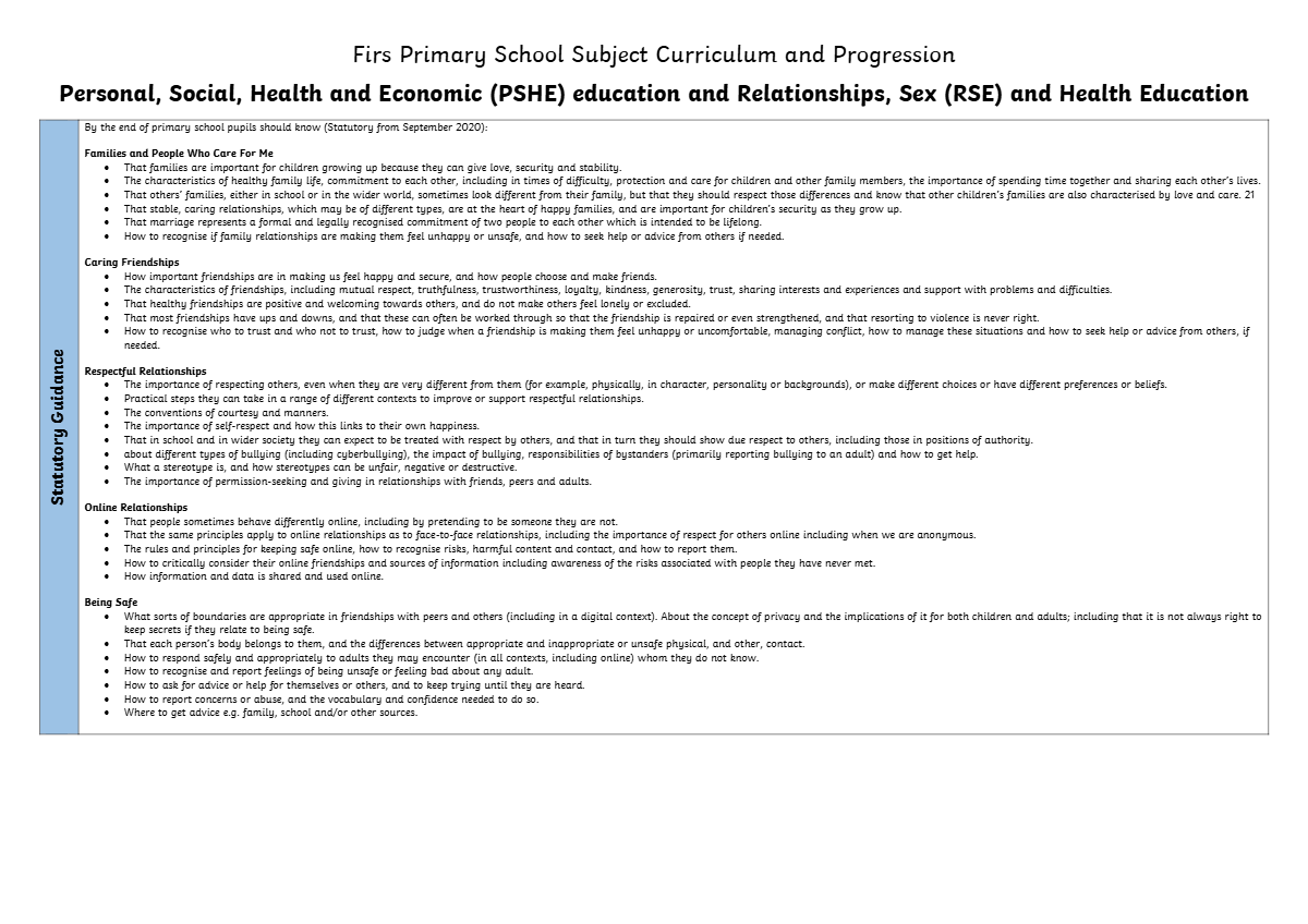 At Firs Primary School we see Personal, Social, Health and Economic Education (PSHE) as being at the centre of all that we do. We aim for all pupils to their resilience, confidence and independence, which will help them keep physically and mentally healthy at each stage of their education. We ensure that children will develop their understanding of fundamental British Values and the world around them through acceptance and appreciation of diversity, celebrating what we have in common and promoting respect.
